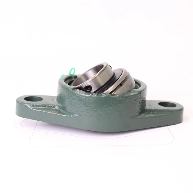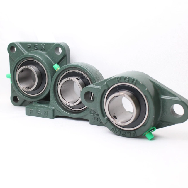 Close-up of a four-bolt flange bearing unit mounted on a stainless steel surface in industrial machinery